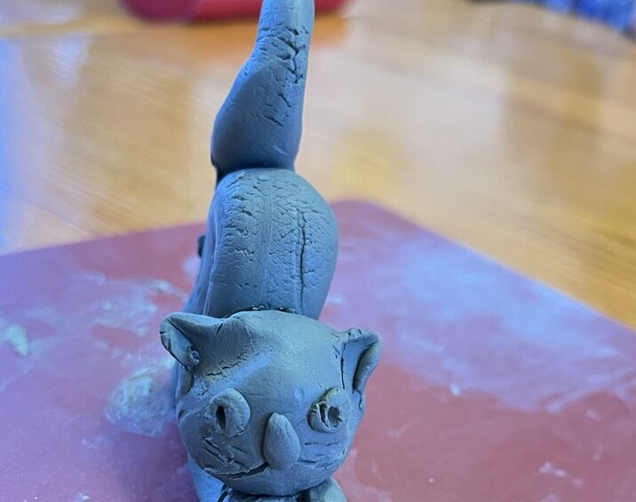 Оксана Евгеньевна - сотрудник музея глины предложила жителям нашего дома-интерната самим слепить фигурку кошки из голубой глины.