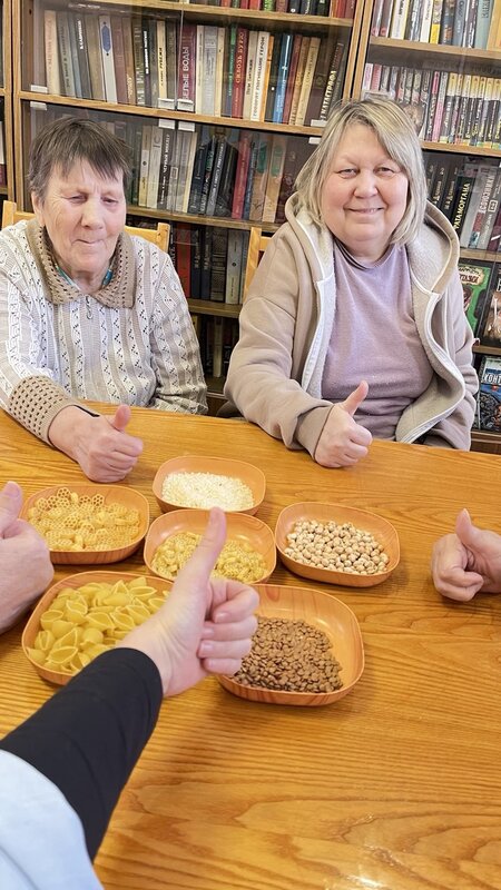 Под вечные хиты Джо Дассен жители неспешно беседовали и развивали мелкую моторику, тактильную чувствительность, улучшая межполушарное взаимодействие мозга и концентрацию внимания.